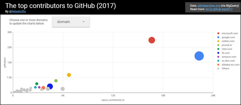 Based on data collected throughout last year and compiled by Google’s BigQuery engine, Microsoft employed the highest number of GitHub contributors for 2017, taking part in the second highest number of repositories worldwide, behind Google. Its own most active repository is VS Code, for the Visual Studio Code editor, which recently displaced its namesake predecessor Visual Studio as Stack Overflow users’ most popular developer environment.